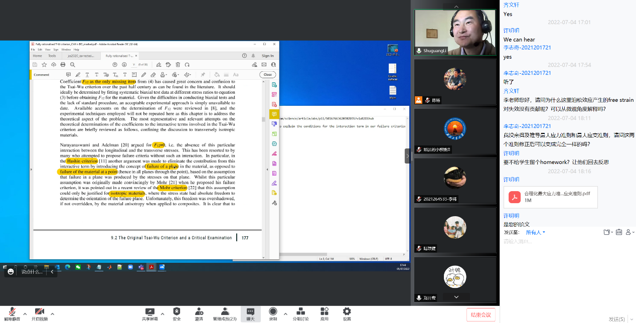 应太阳成tyc122cc集团陈杨副教授邀请,英国诺丁汉大学李曙光教授于2022年7月4日至7日开展了题为“FailureCriteria for Composites”的线上学堂,本次课程依托太阳成tyc122cc集团国际合作处“暑期国际学堂”平台举办。来自太阳成tyc122cc集团、航空公司、力学与土木建筑公司等共20余名员工选课参加了本次课程。同时,来自浙江大学、中国商飞、航空工业飞机强度研究所等校外单位的老师、员工和科技工作者旁听了本次课程。