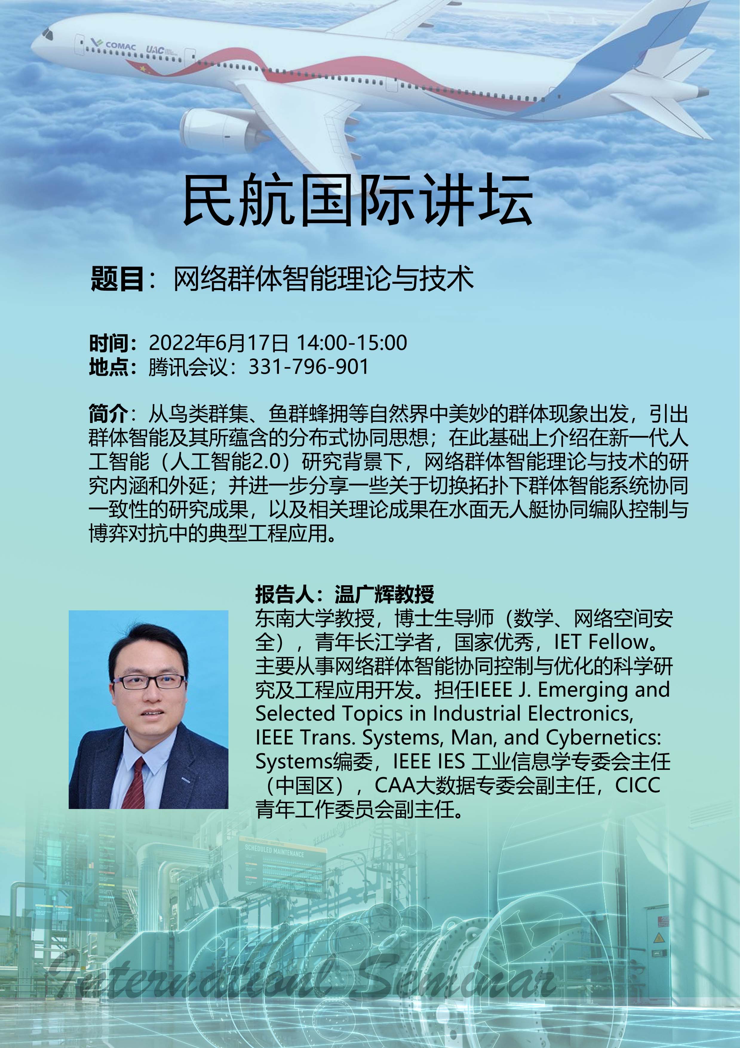 6月17日下午两点,公司拟线上举办“网络群体智能理论与技术”专题讲座,届时欢迎各位老师同学参会交流。报告信息如下: