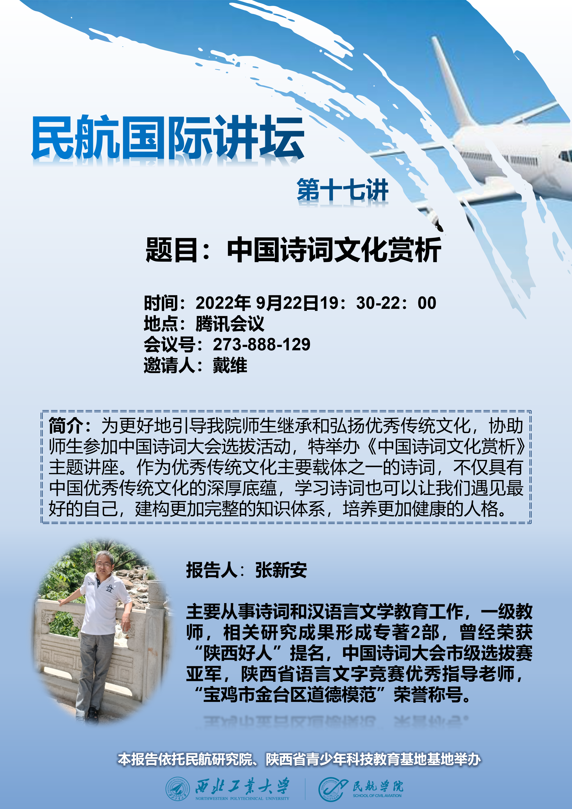 9月22日晚七点三十分,公司拟线上举办“中国诗词文化赏析”专题讲座,届时欢迎各位老师同学参会交流。讲座信息如下: