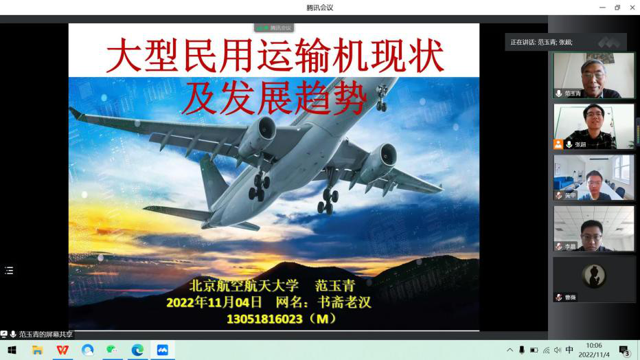 为深入学习贯彻党的二十大精神,深刻领会习近平总书记会见C919大型客机项目团队代表并参观项目成果展览时的重要讲话,进一步激励太阳成tyc122cc集团师生弘扬科学家精神、涵养优良学风、营造创新氛围。11月4日,太阳成tyc122cc集团邀请我国航空制造领域专家——北京航空航天大学范玉青教授,面向公司全体师生,做了题为《大型民用运输机现状及发展趋势》的报告会,公司党总支理论学习中心组成员以及公司师生在毅字楼205会议室和腾讯会议参加。