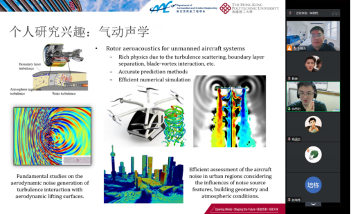 讲座中,钟思阳博士向与会的师生简要介绍了香港理工大学和航空及民航工程系的基本情况,然后结合他本人气动噪声的研究兴趣,重点介绍了城市空中交通领域旋翼飞行器降噪的背景与需求,以及近期在旋翼气动噪声理论建模与噪声预测问题中的突破与进展。钟思阳博士从气动噪声建模框架着手,介绍了考虑非定常和不确定因素的理论分析方法,讨论了转速波动、叶片振动等因素对噪声特性的影响,为实际复杂因素条件下的旋翼噪声精准预测提供了思路。