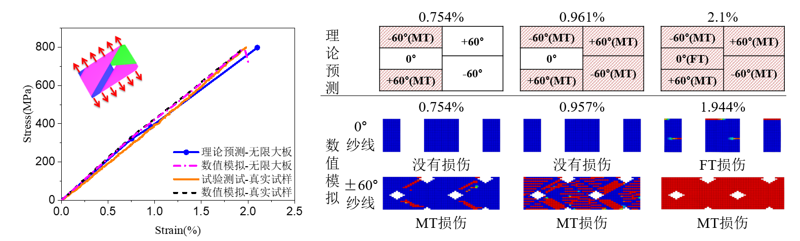 图2(a)二维三轴编织复合材料在轴向拉伸载荷下力学响应的对比(理论预测、数值模拟和试验测试);(b)二维三轴编织复合材料在轴向拉伸载荷下渐进损伤过程对比(理论预测和数值模拟)。其中,MT代表基体拉伸;FT代表纤维拉伸