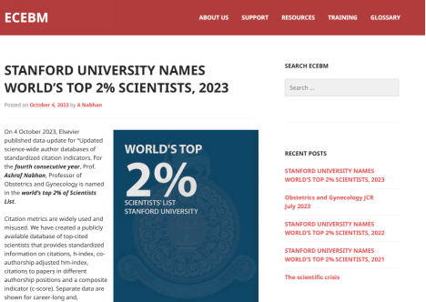 2023年10月,美国斯坦福大学和爱思唯尔数据库(Elsevier Data Repository)发布第六版《年度全球前2%顶尖科学家榜单》(World’s Top 2% Scientists),包括“终身科学影响力排行榜”和“2022年度科学影响力排行榜”两个榜单。“终身科学影响力”关注科研人员整个学术生涯迄今的影响力,“年度科学影响力”则聚焦科研人员本年度(2022年)的学术成就。