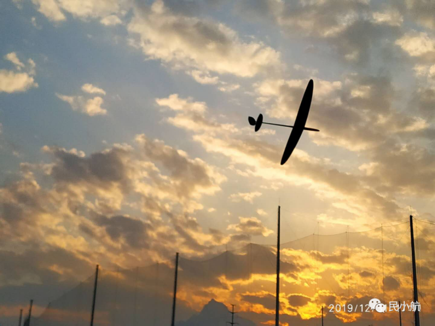傍晚的星天苑操场,夕阳的光在乱云中折射,这明明是一派日落的景象,却又因为这架飞机平添了希望与朝气。金色的光影之上,一架航模自顾自飞过,自由而又洒脱。这幅图展现了西工大学子寄托在航模上的志趣,又体现了西工大的航空特色。
