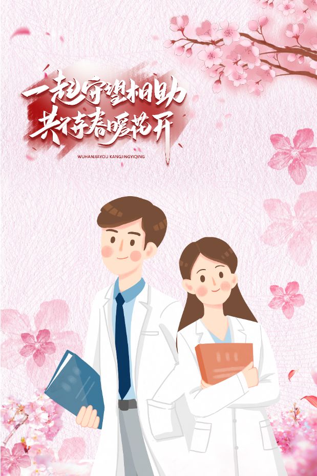 作品说明:共有三个元素——白衣天使,春日樱花象征武汉,和共克时艰的字样。盼望所有医护人员疫情结束后可以平安归来,盼望武汉迎来暖融融的春天。
