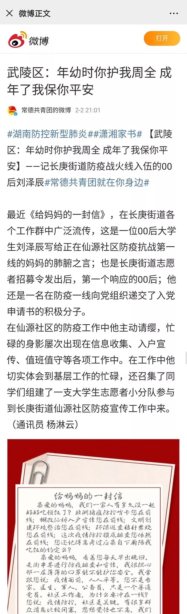 于是第二天,我去响应了武陵区长庚街道志愿者招募令,成为了一名光荣的防疫志愿者,值得一提的是,由于招募令发布没多久,我成为了长庚街道第一个00后志愿者。