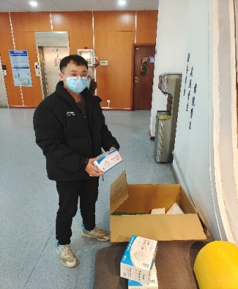 12月22日,公司为参加研考的同学发放N95口罩和检测抗原。胡忠阔、贺文择两位同学冒着风险、牺牲个人时间,主动提出帮助全年级同学们进行领取和发放,确保大家在考前的冲刺阶段没有后顾之忧。辅导员老师提出要拍照片宣传这样的好人好事,他们却婉言谢绝。