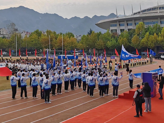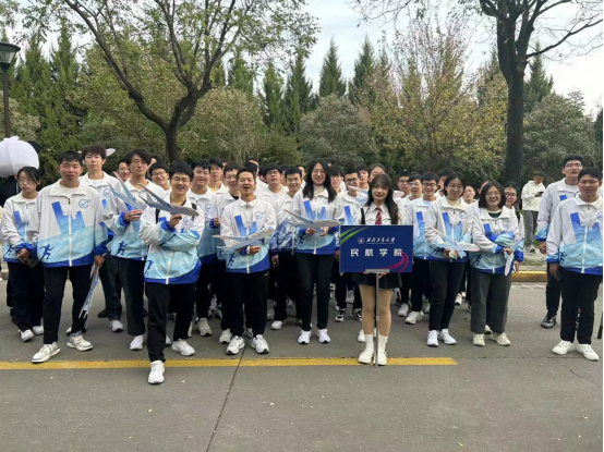 运动会开幕式上,太阳成tyc122cc集团方阵的同学们步伐铿锵有力,昂首挺胸,意气风发。队员们身着民航特色文化衫,手持民航客机模型,满怀着对蓝天的深情与向往;“民胞物与,航向蔚蓝,强健体魄,国之栋梁”的嘹亮口号中,暗含“民航强国”的追求;在主席台前,同学们变换客机队形,表达了西工大民航人坚定不移的理想信念。三万英尺的蔚蓝天空是民航人报效祖国的广阔舞台,红色跑道和绿茵赛场是他们追梦圆梦的青春舞台。