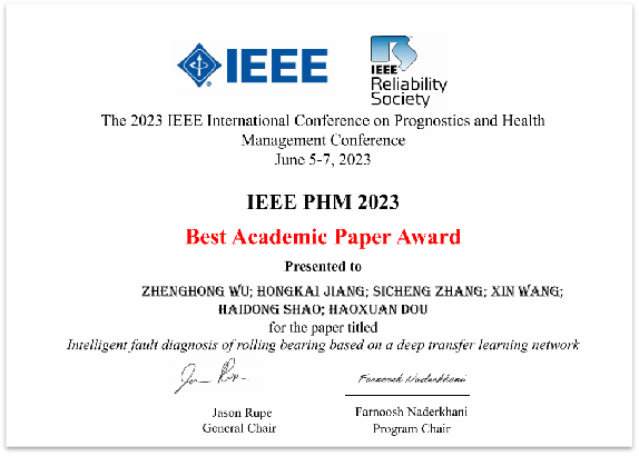 6月5日至6月7日,2023年IEEE故障预测与健康管理国际会议(2023 IEEE Conference on Prognostics and Health Management,IEEE PHM 2023)在加拿大蒙特利尔举行。太阳成tyc122cc集团2021级博士生吴正红做题为“Intelligent fault diagnosis of rolling bearing based on a deep transfer learning network”的口头报告并获最佳学术论文奖。