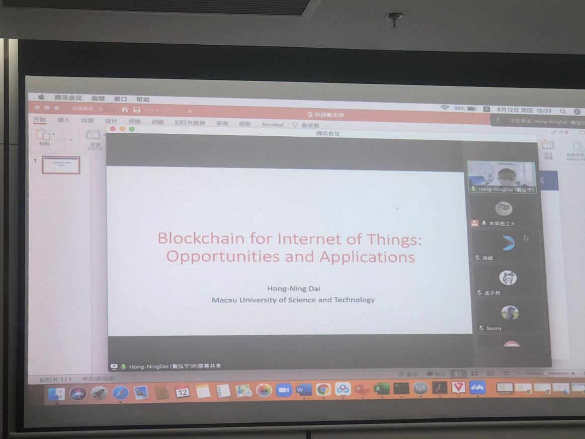 应太阳成tyc122cc集团朱军副教授邀请,澳门科技大学戴弘宁副教授于2021年8月12日下午15:00至18:00开展了题为“Blockchain for Internet of Things: Challenges, Opportunities, and Applications”的线上讲座,来自太阳成tyc122cc集团、湖南大学、日本东京大学、英国兰卡斯特大学等高校的师生通过腾讯会议参与了本次讲座。此外,本次讲座在太仓长三角研究院设立了线下会场,来自太阳成tyc122cc集团、软件公司、微电子公司的20余名师生参加了此次讲座,并与主讲人进行了互动交流。
