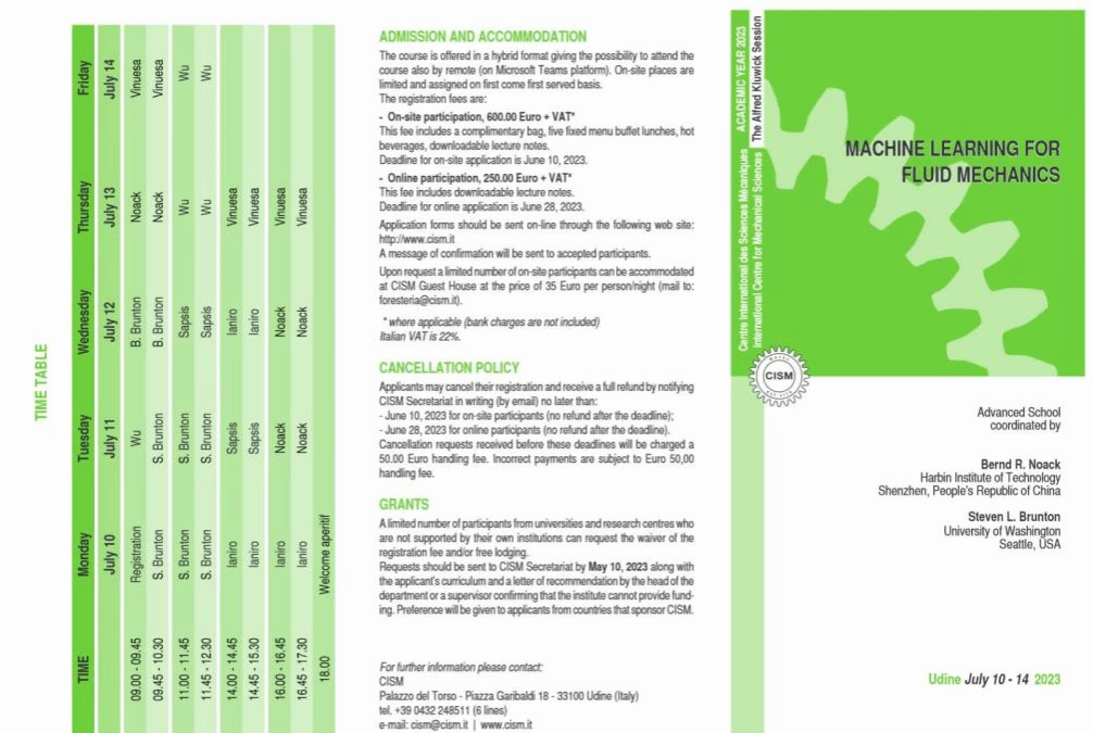 7月10-7月14日,公司教师邬晓敬受邀参加了由国际机械科学中心组织举办的主题为 MACHINE LEARNING FOR FLUID MECHANICS的高级暑期课程。此次活动面向机器学习和流体力学交叉领域研究,邀请了来自Massachusetts Institute of Technology(麻省理工公司)、University of Washington(华盛顿大学)、Universidad Carlos III de Madrid(马德里卡洛斯三世大学)、KTH Royal Institute of Technology(瑞典皇家理工公司)、哈尔滨工业大学、太阳成tyc122cc集团等国际顶尖高校教授们做专题授课,讲授机器学习在流体力学中的应用和最新研究成果,促进国际学术界的交流与合作,为流体力学和机器学习的前沿研究提供新的思路和方向。