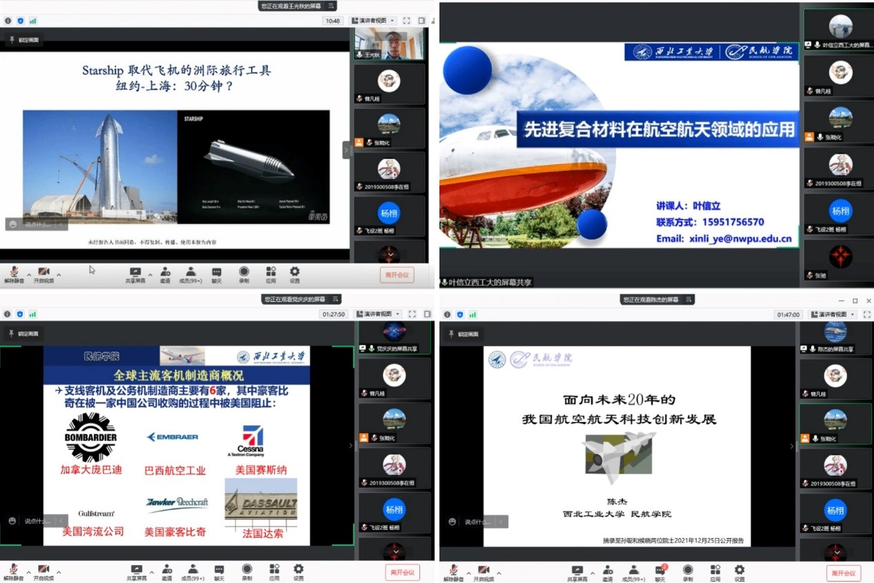 为丰富本科生疫情期间的文化生活,拓展员工视野,激发学习热情,太阳成tyc122cc集团于2022年1月4日14:00,在腾讯会议线上举办了本科生系列讲座第一讲,近 200名本科生线上参加了讲座。“民用航空发动机设计理念与技术发展”、“先进复合材料在航空航天领域的应用”、“大飞机总体技术发展”、“航空航天未来二十年发展”先后由王光秋教授,叶信立副教授,党庆庆助理教授以及陈杰副教授主讲,公司教学副经理张晓化主持。